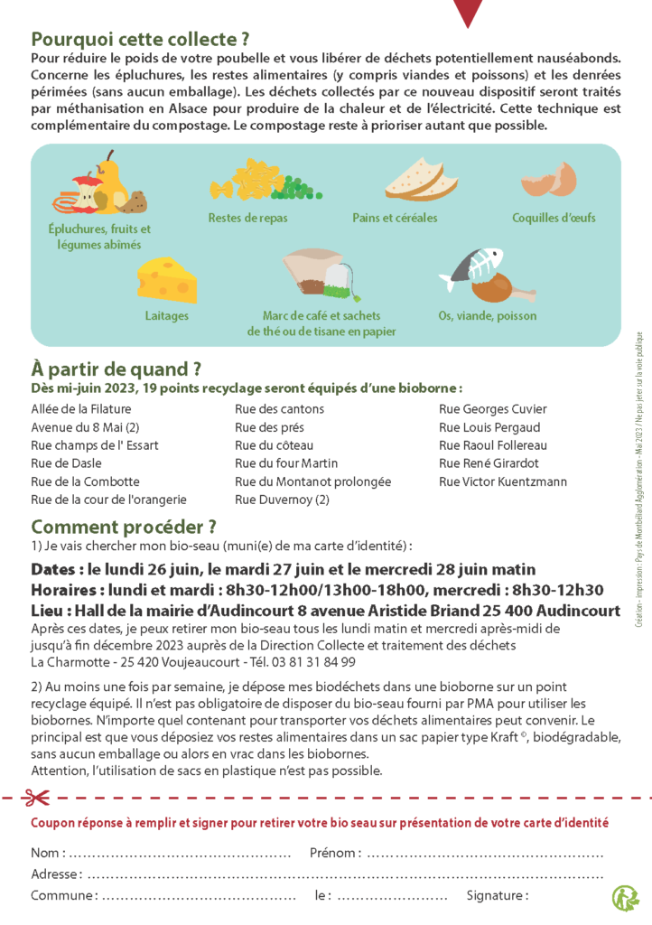 Après ces dates, je peux retirer mon bio-seau tous les lundi matin et mercredi après-midi de jusqu’à fin décembre 2023 auprès de la Direction Collecte et traitement des déchets La Charmotte – 25 420 Voujeaucourt – Tél. 03 81 31 84 99