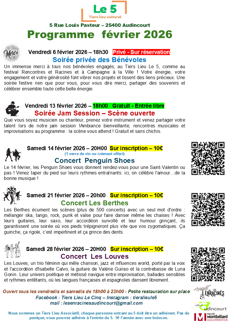 🎭🎶 Janvier et février 2026 au 5 – Tiers lieu culturel à Audincourt