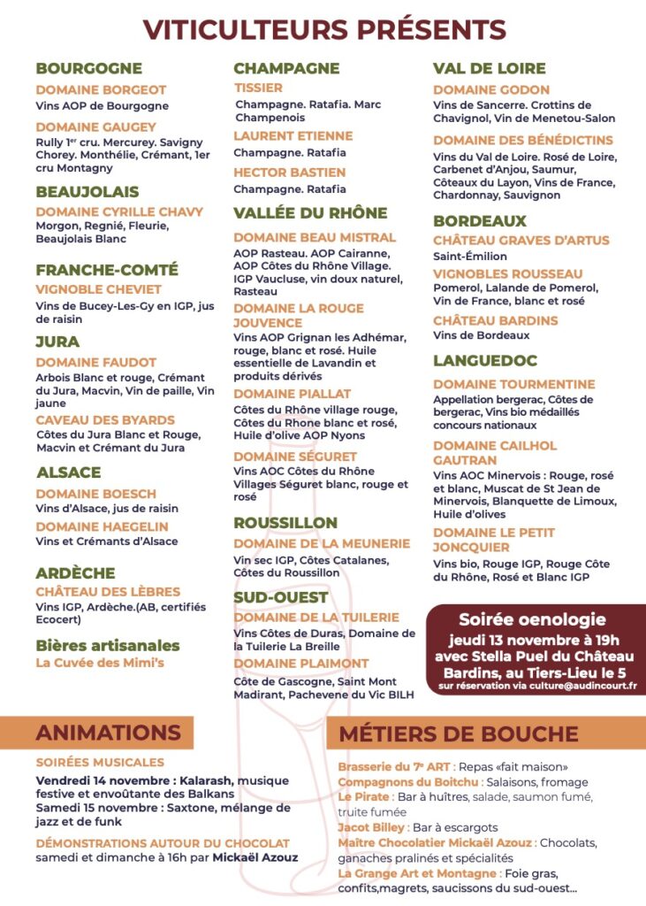 Du 14 au 16 novembre 2025, La Filature d’Audincourt se transforme en lieu de rencontre pour tous les amateurs de vin et de gastronomie. Ce rendez-vous incontournable du goût invite le public à découvrir des produits authentiques et de qualité dans une ambiance conviviale et chaleureuse.