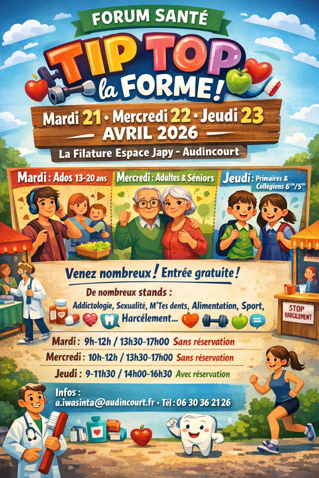 Du 21 au 23 avril, La Filature d’Audincourt ouvrira ses portes pour accueillir la nouvelle édition du forum « Tip Top la Forme », organisé par le Centre communal d’action sociale (CCAS) en collaboration avec la Ville.