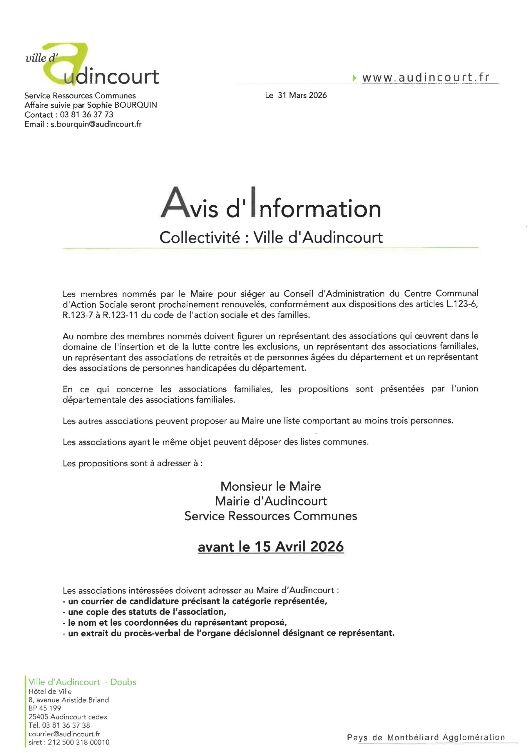 Dans le cadre du renouvellement du Conseil d’Administration du Centre Communal d’Action Sociale (CCAS), la Ville d'Audncourt invite les associations intéressées à proposer leurs représentants.